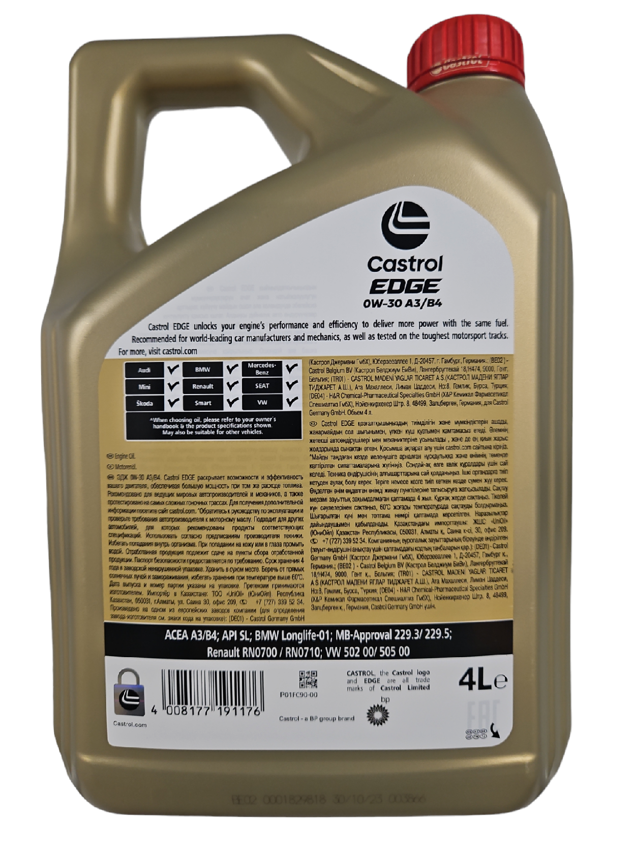Моторное масло CASTROL EDGE A3/B4, 0W-30, 4л, синтетическое (1533EB)