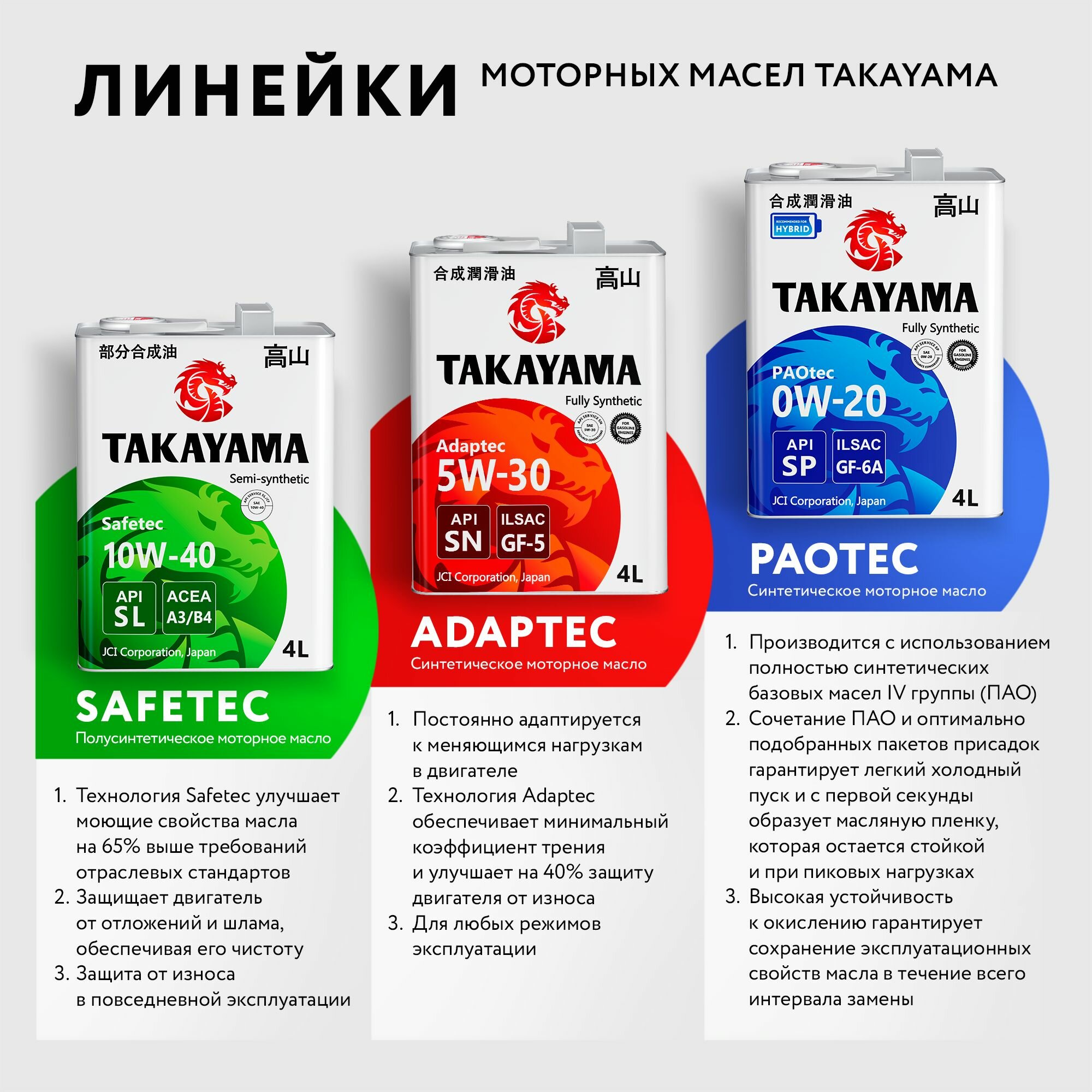 Акция 4+1 Моторное масло TAKAYAMA ADAPTEC SAE 5W-30, ILSAC GF-5, API SN Синтетическое 4 л