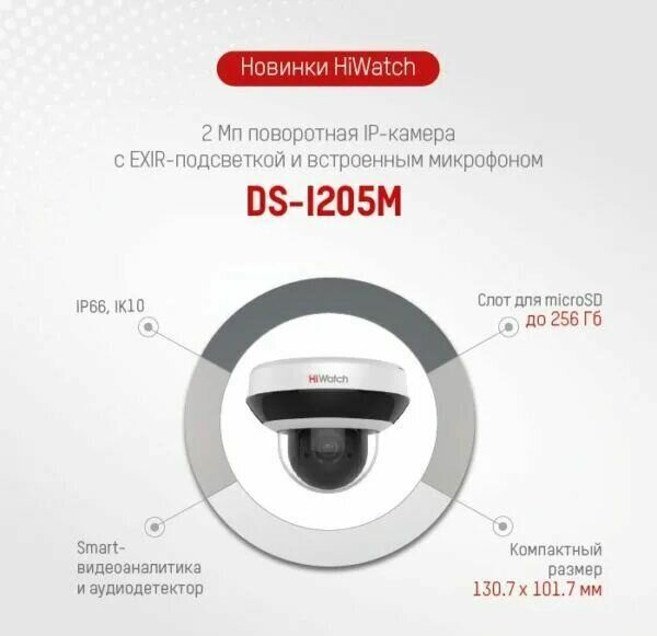 DS-I205M HiWatch Скоростная поворотная купольная IP видеокамера, объектив 2.8-12мм, 2Мп, PoE, слот для microSD, встроенный микрофон