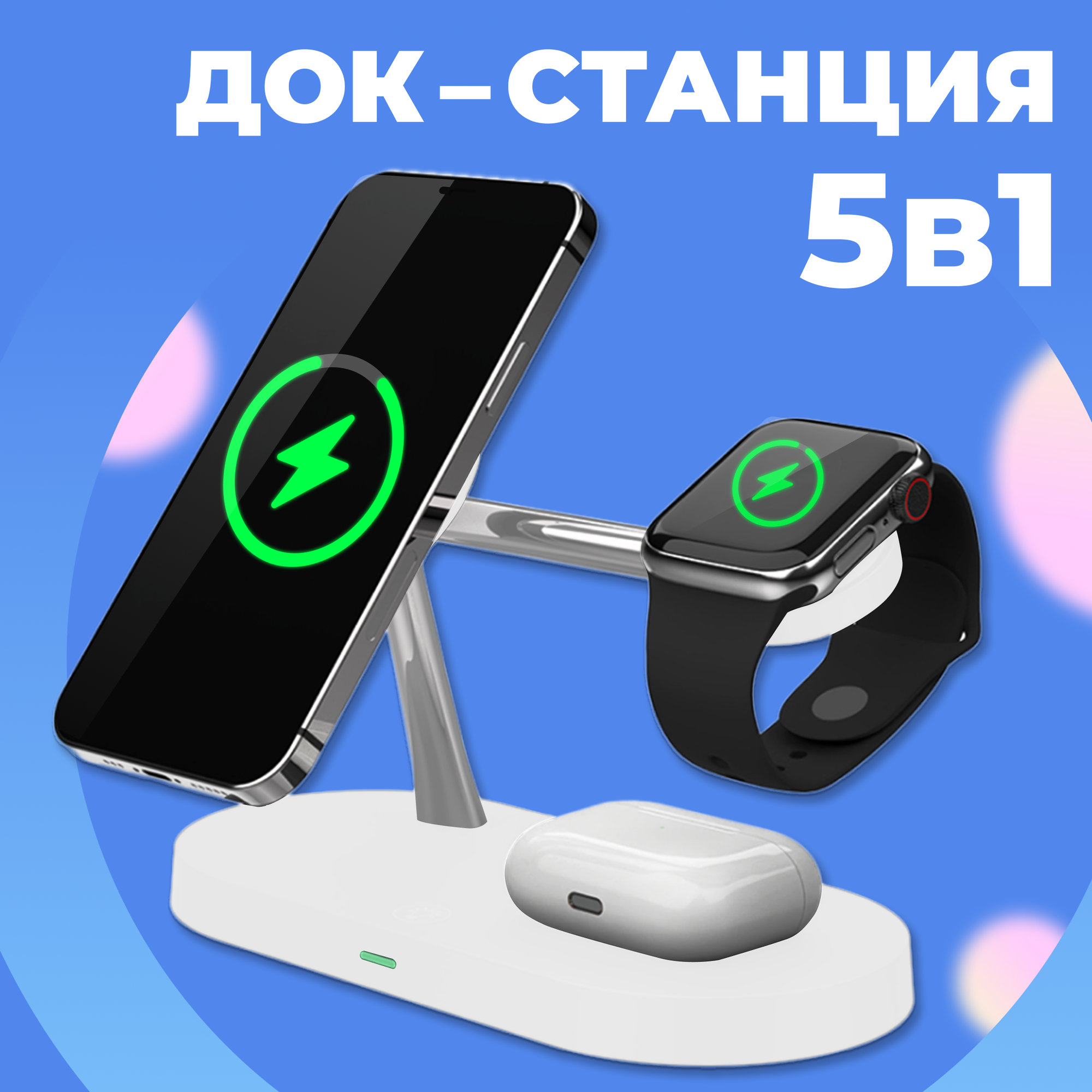Купить Беспроводная док станция 5 в 1 MagSafe 15W для Apple iPhone, Apple Watch и AirPods / Зарядка на Эпл Айфон, Эпл Вотч и Аирподс / Белая