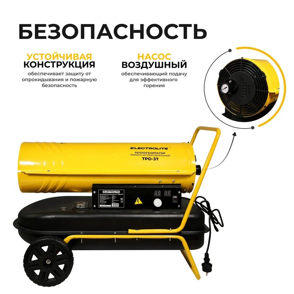 Тепловая пушка / Дизельная тепловая пушка / Тепловая пушка дизельная ELECTROLITE TPD-37 (37000 Вт, 750 м3/час, 220 В, 2.8 л/час, Термостат) с электронной регулировкой температуры