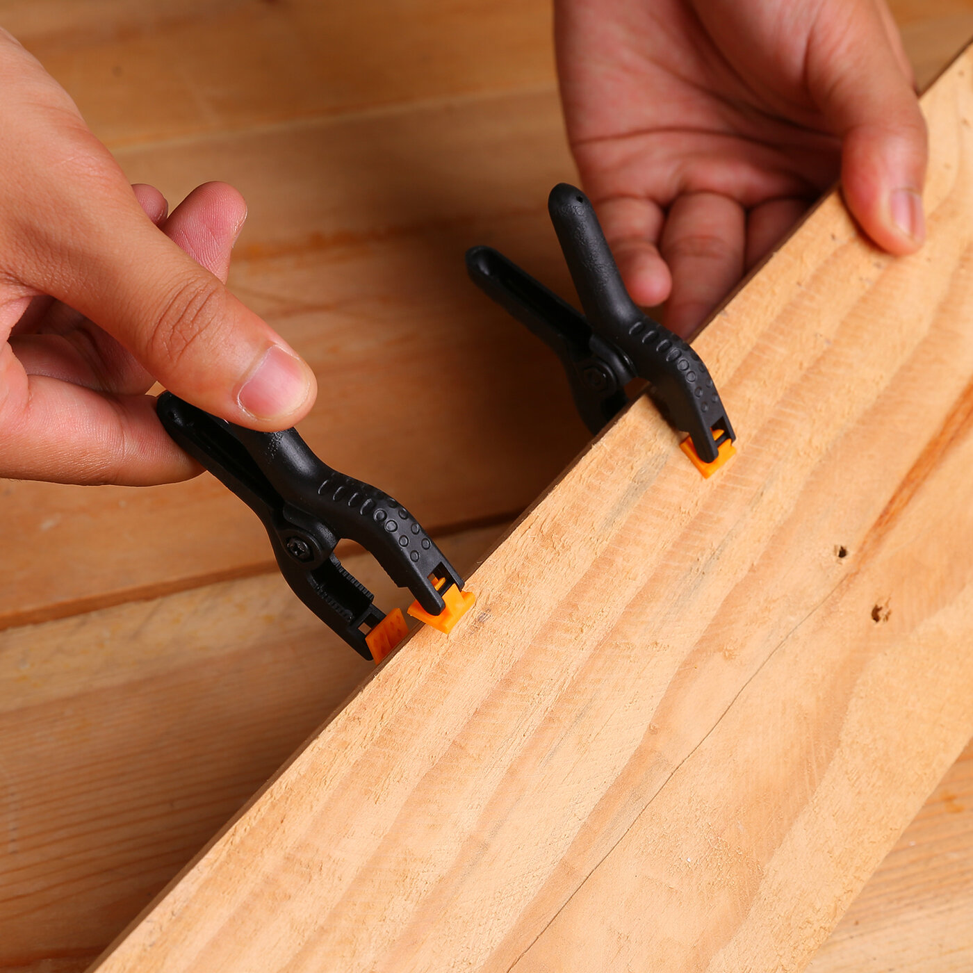 | Плюсы: | Поворотные зажимы на концах прищепок, позволяют сильнее прижать материал. |