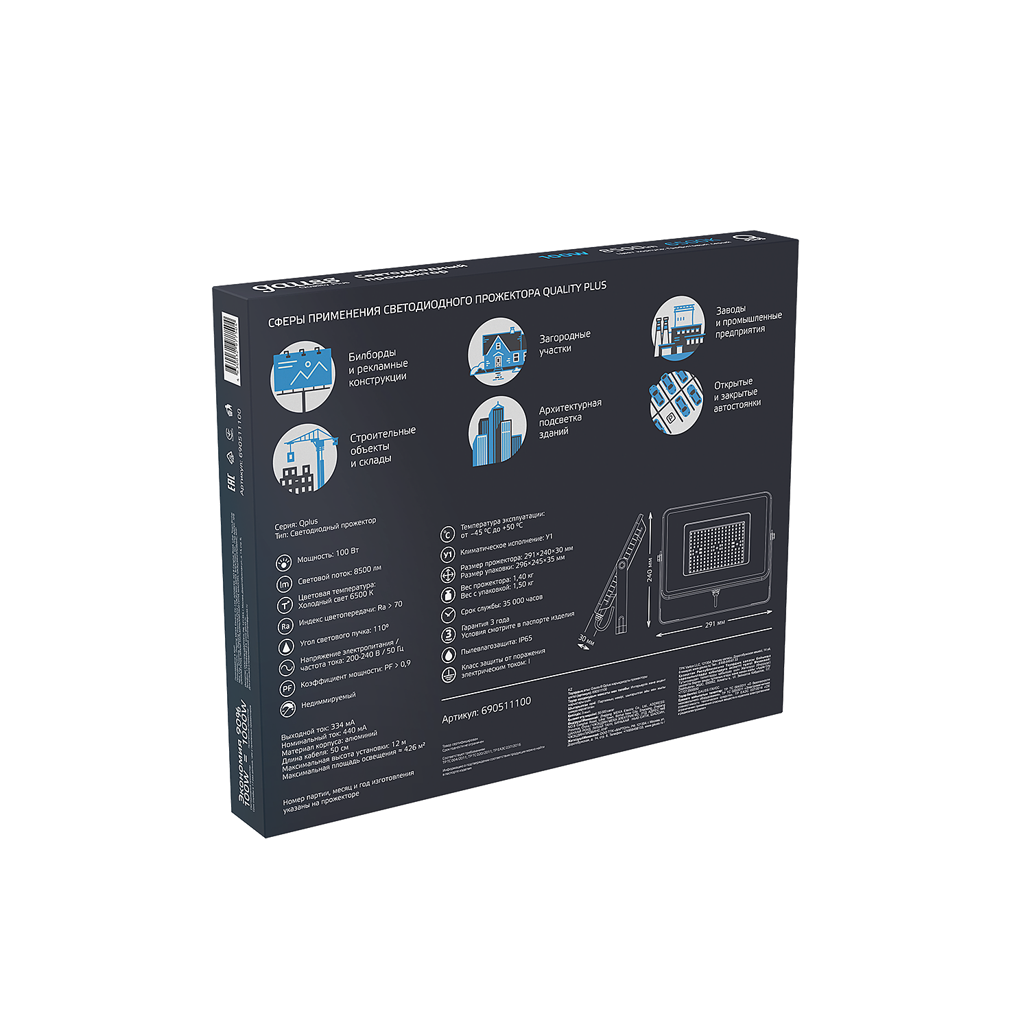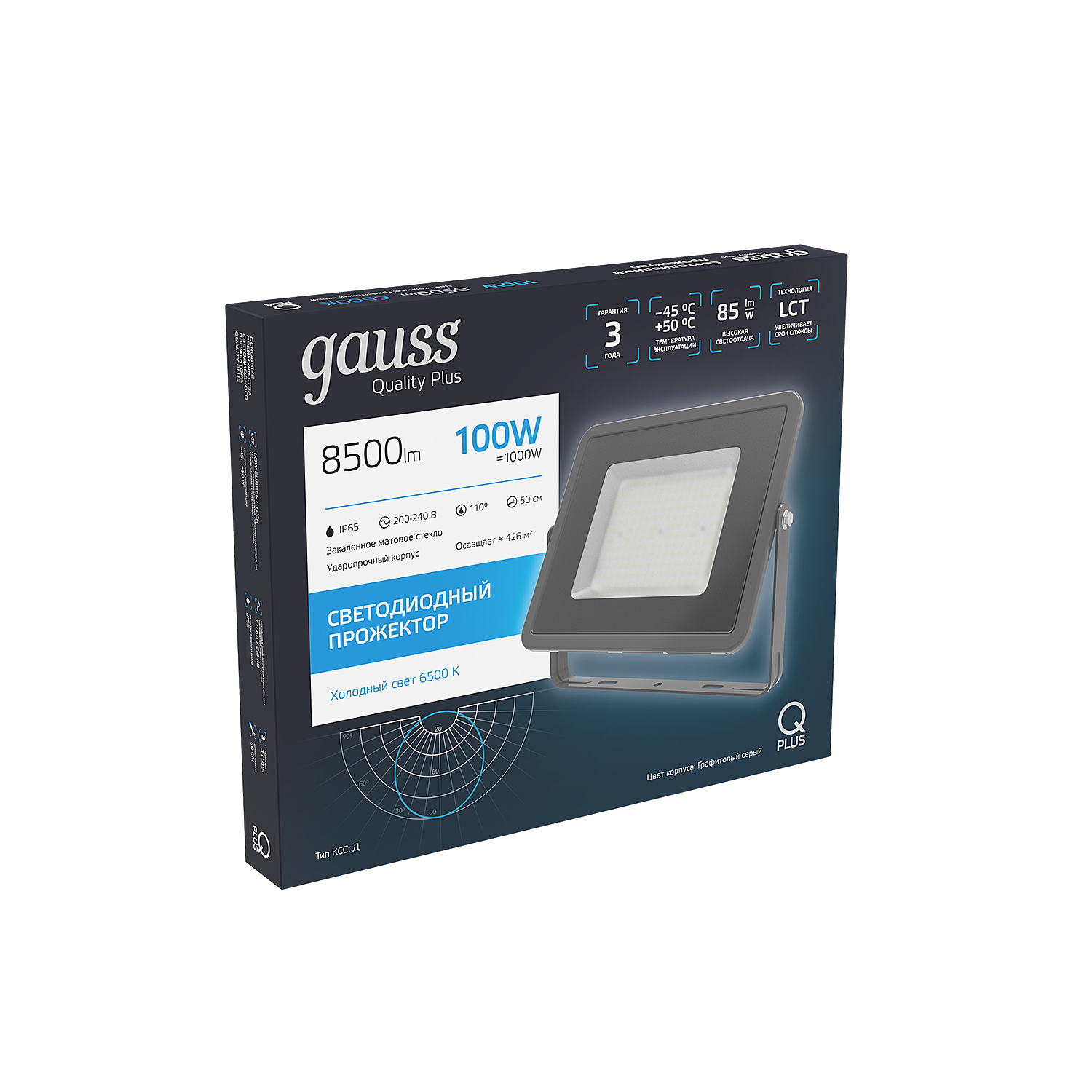 Прожектор светодиодный Qplus 100Вт 6500К 8500лм IP65 графит. сер. 1/4, GAUSS 690511100 (1 шт.) интересное:
