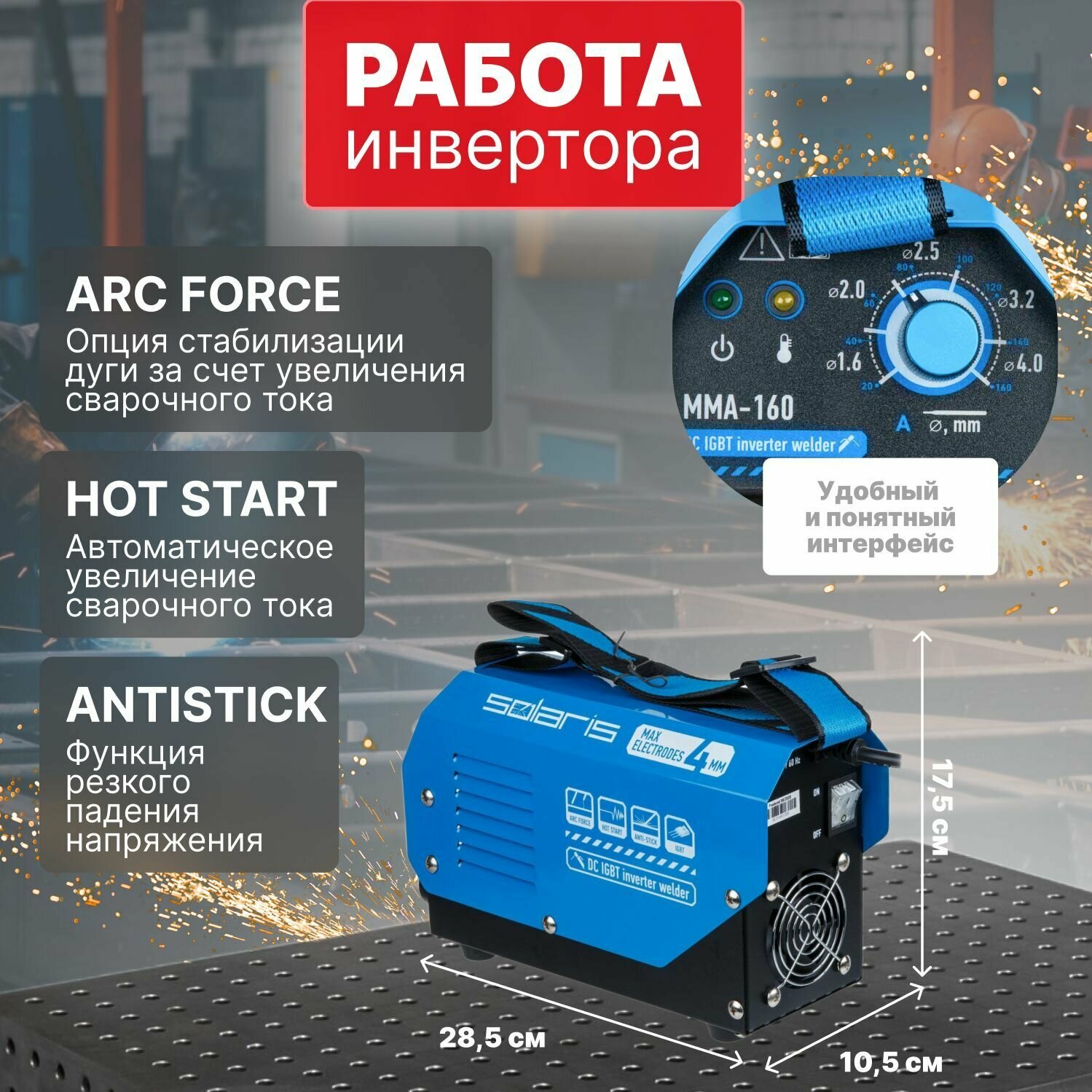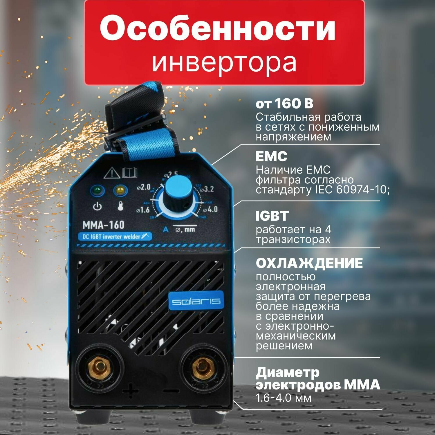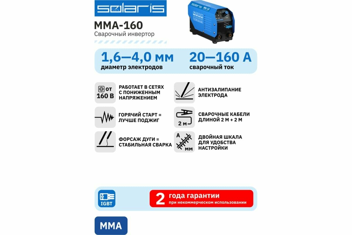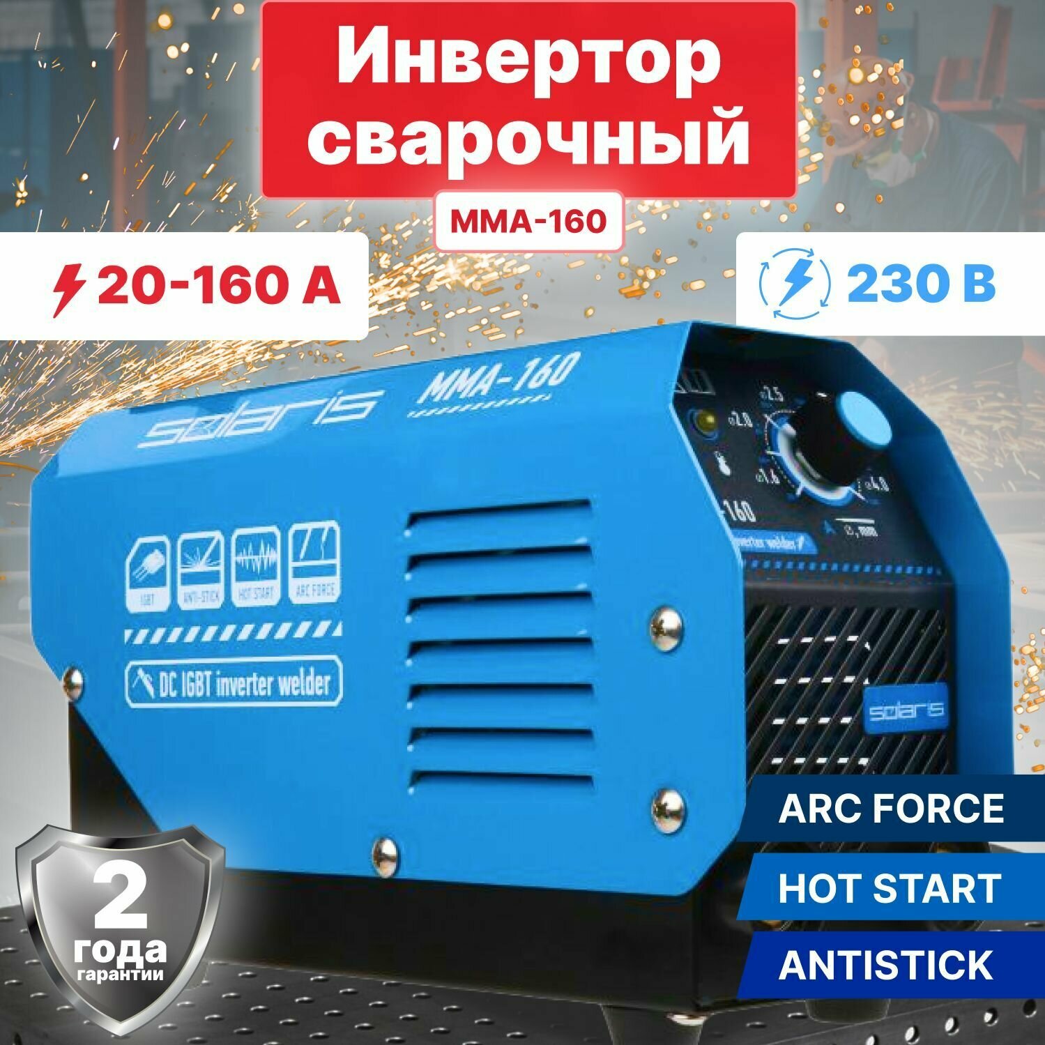 Инвертор сварочный SOLARIS MMA-160 (230В; 20-160 А; 69В; электроды диам. 1.6-4.0 мм; вес 3.0 кг)