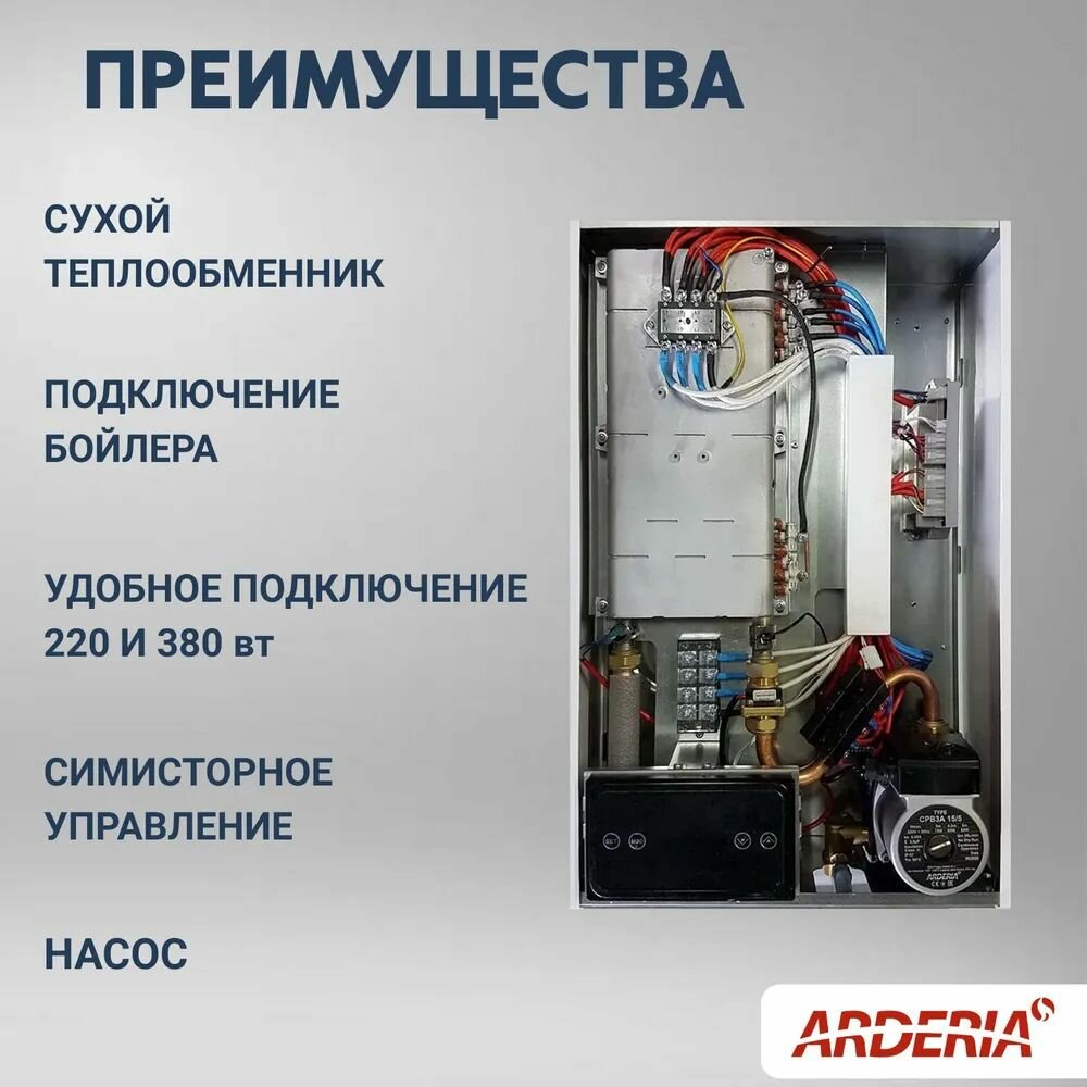 Электрический котел Arderia E20, с возможностью подключения бойлера / одноконтурный / для отопления / сухой тэн / семисторная защита / Ардерия
