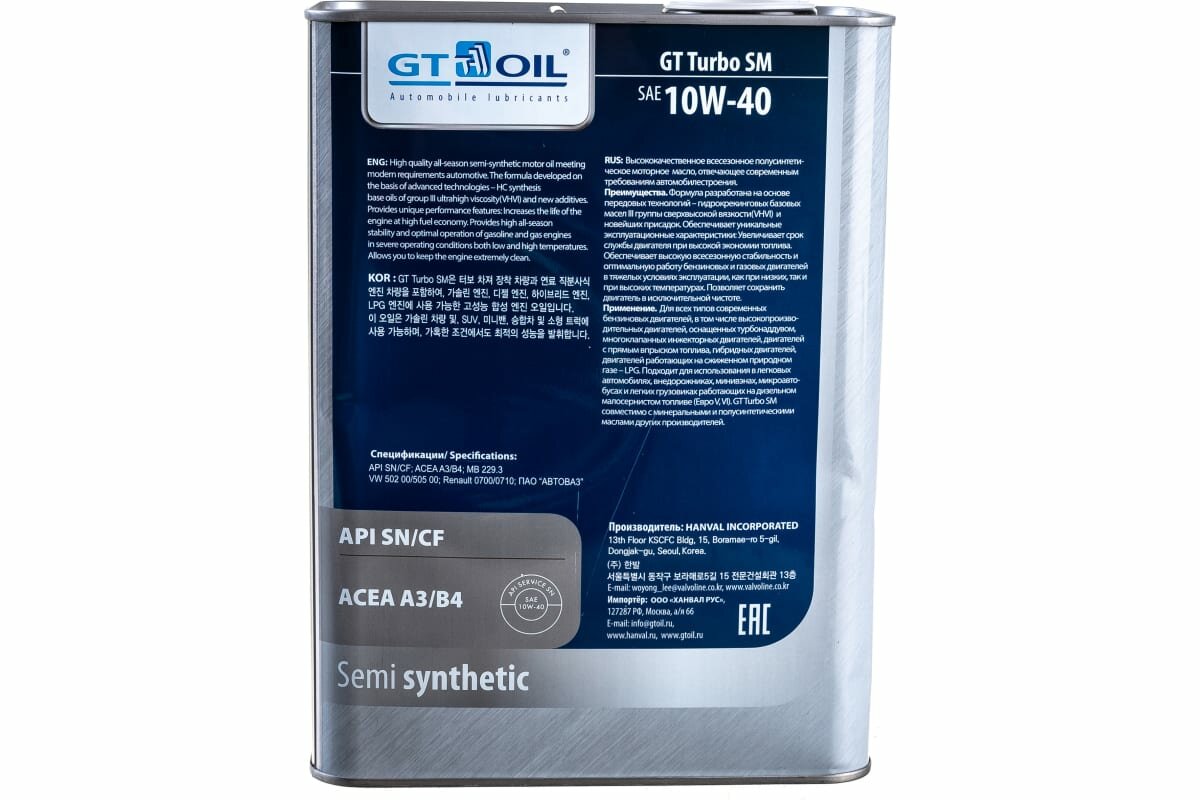 Масло моторное gt oil gt turbo sm 10w-40 полусинтетическое 4 л 8809059407028