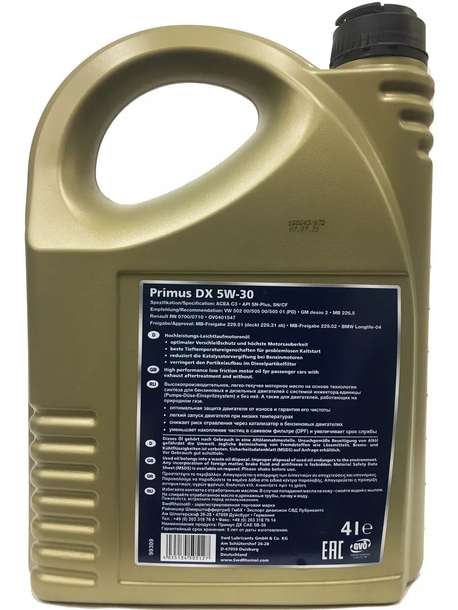 SWD Rheinol Масло Swd Rheinol Primus Dx 5W-30 Sn/Cf/A3/B4/C3 (4Л) 31228470