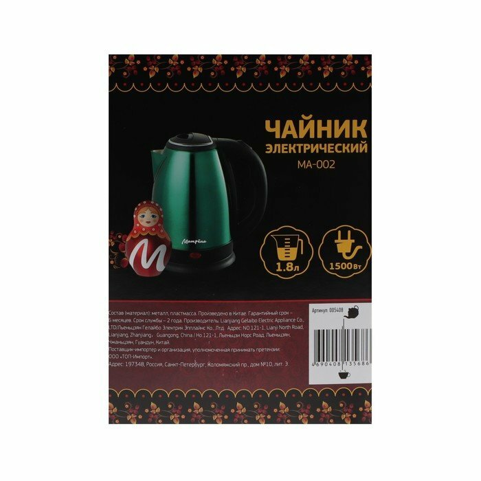 Матрёна Чайник электрический матрёна MA-002, металл, 1.8 л, 1500 Вт, зелёно-чёрный