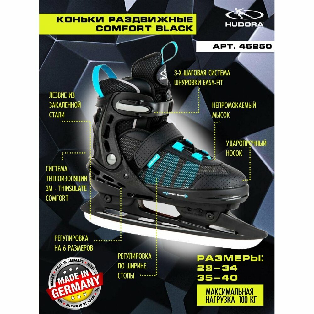 Коньки ледовые раздвижные HUDORA Comfort black размер 29-34 (черный)