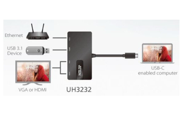 Док-станция Aten UH3232-AT 4хUSB 3.1 Gen 1+VGA+HDMI+RJ45, питание от шины, некаскадируемый