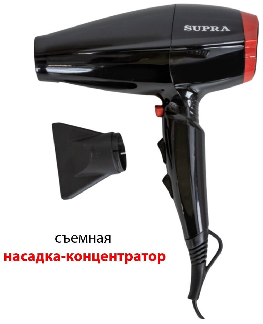 Фен для волос Supra с функцией холодного воздуха и концентратором, 2 скорости, 3 режима нагрева, 2000 Вт, красный, черный SUPRA PHS-2017M
