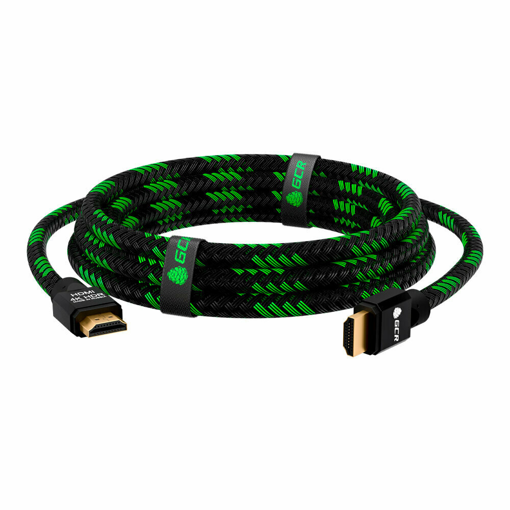 Видео-кабель 2м HDMI GCR Ultra HD 4K 3D 18 Гбит/с частично нейлон для игровых консолей черно-зеленый 24К GOLD