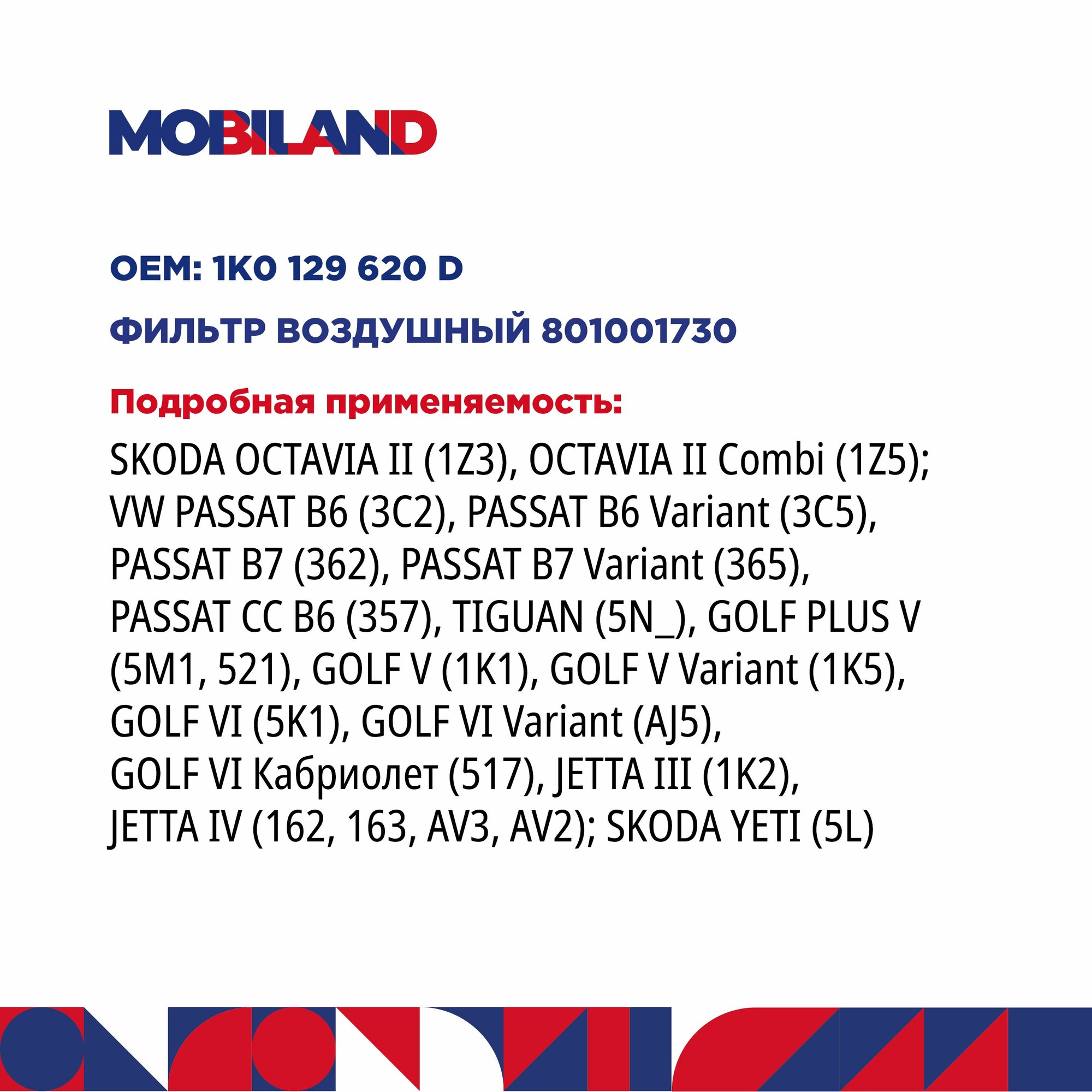 Фильтр воздушный для а/м SKODA OCTAVIA II (1Z3), YETI (5L); VW TIGUAN (5N_), JETTA IV (162, 163, AV3, AV2) Mobiland 801001730
