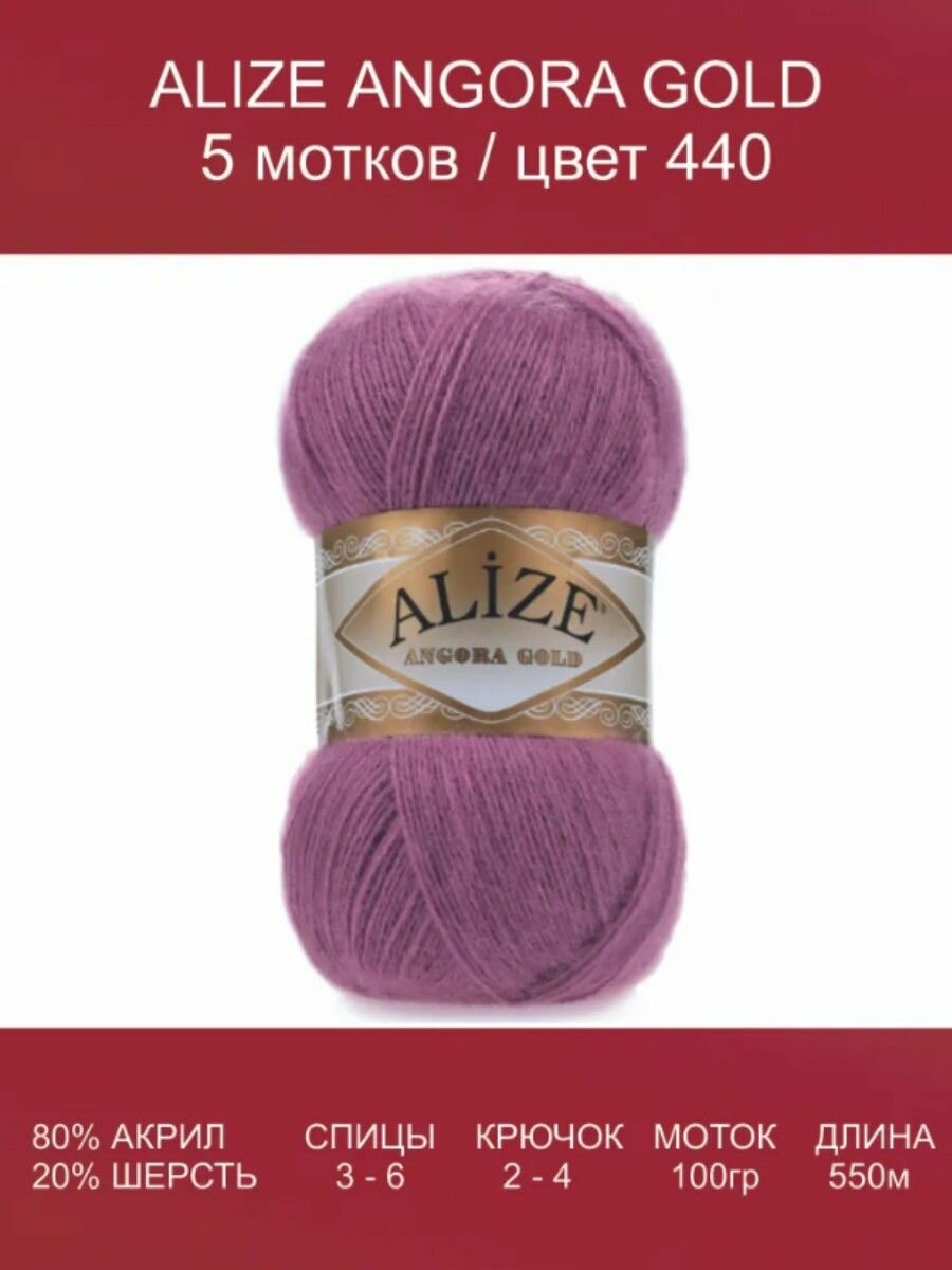 Пряжа ALIZE 'Angora Gold' 100гр. 550м (80% акрил, 20% шерсть) ТУ (111 т.лиловый). В комплекте 5 штук.