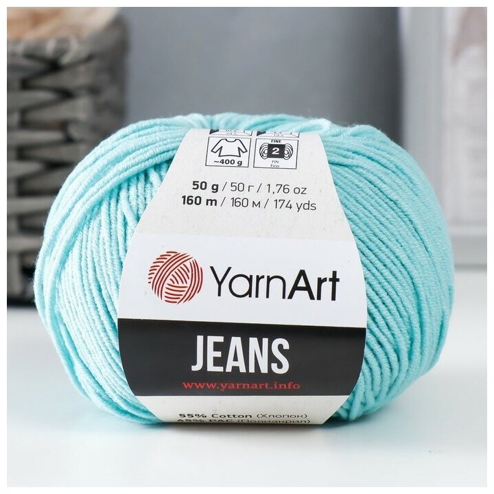 Пряжа YarnArt Jeans, цвет бирюзово-голубой 33, 1 моток, 50г/160м, состав 45% акрил, 55% хлопок, ярнарт джинс