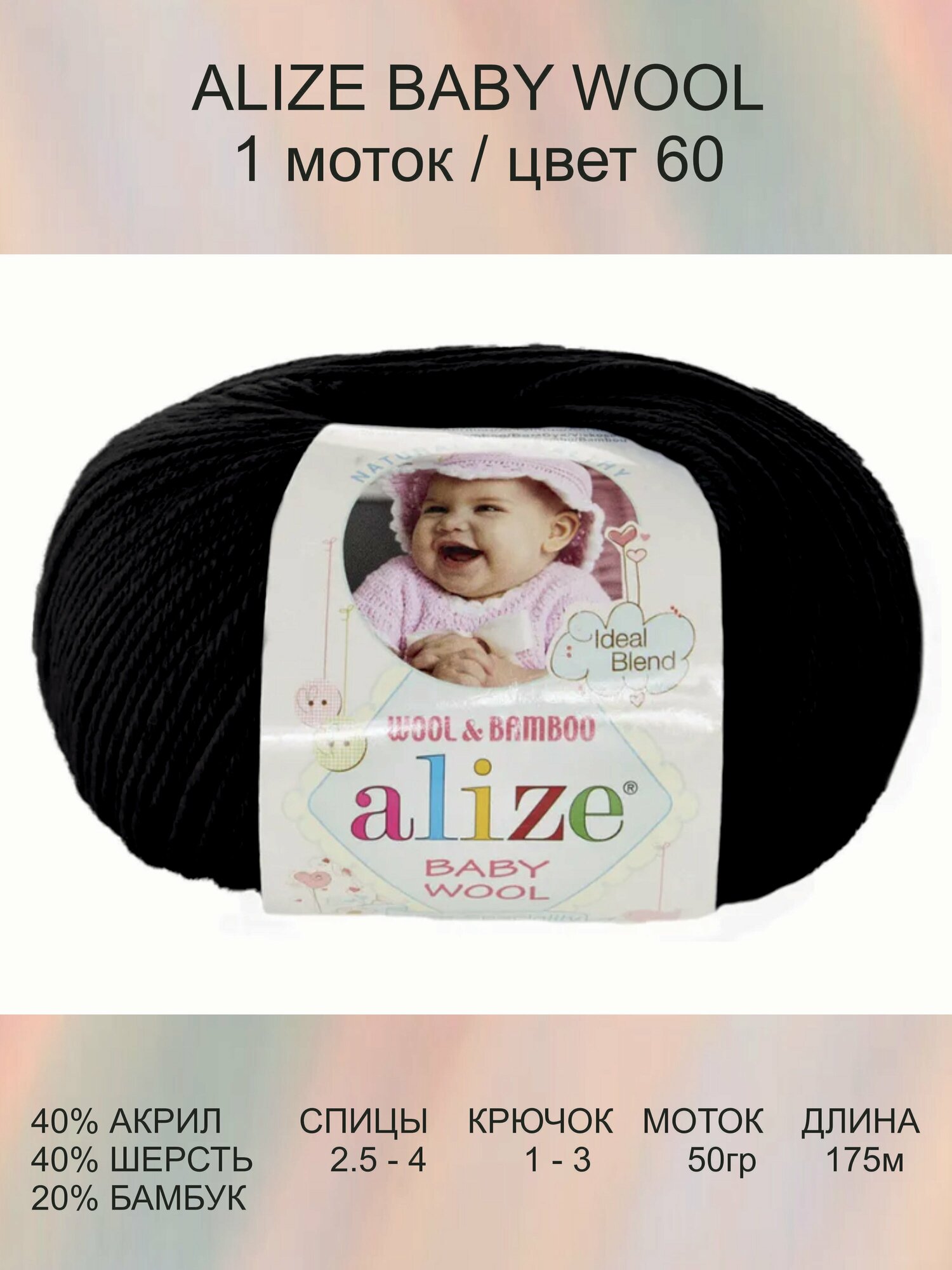 Пряжа Alize Baby Wool (40% шерсть, 20% бамбук, 40 % акрил) 50 гр, 175 м, 60 черный , 1 моток