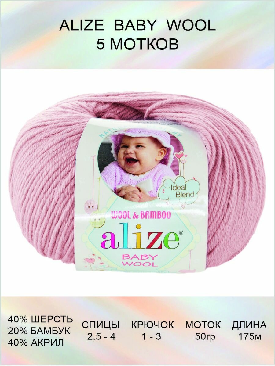 Пряжа для вязания ALIZE BABY WOOL Ализе Бэйби Вул Детская: 185 (светло-розовый) / 5 шт / 175 м / 50 г / 40% шерсть, 20% бамбук, 40% акрил