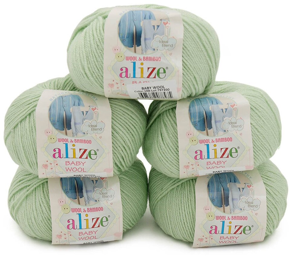 Купить Пряжа Alize Baby Wool (Ализе Беби Вул) - 5 мотков Цвет: 188, Зеленая мята, 40% шерсть 20% бамбук 40% акрил, 50 г / 175 м