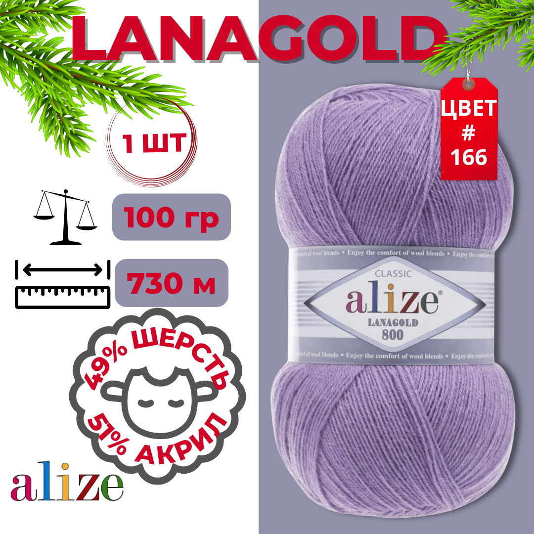 Купить Пряжа Alize Lanagold 800 сиреневый (166), 51%акрил/49%шерсть, 800м, 100г, 1шт