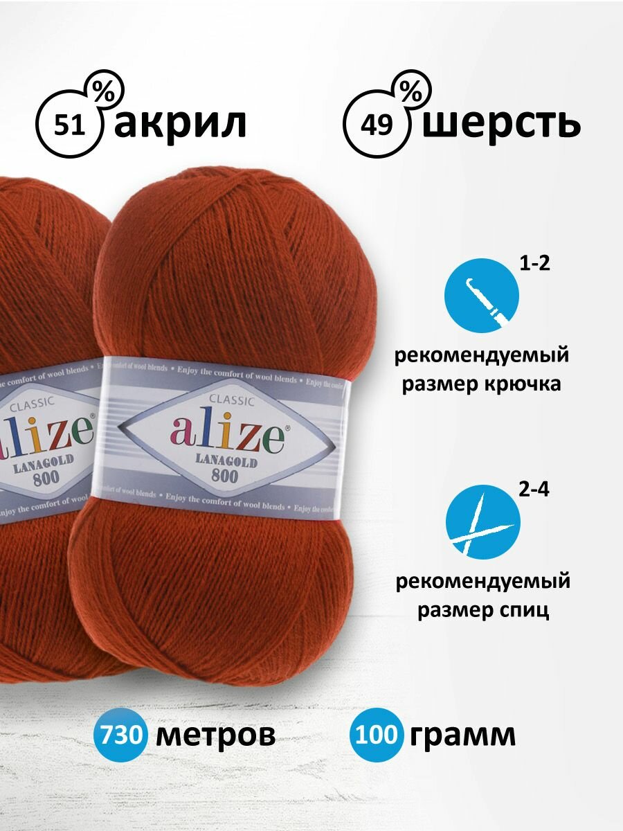 Пряжа для вязания ALIZE 'Lanagold 800', 100г, 730м (49% шерсть, 51% акрил) (36 терракот), 5 мотков
