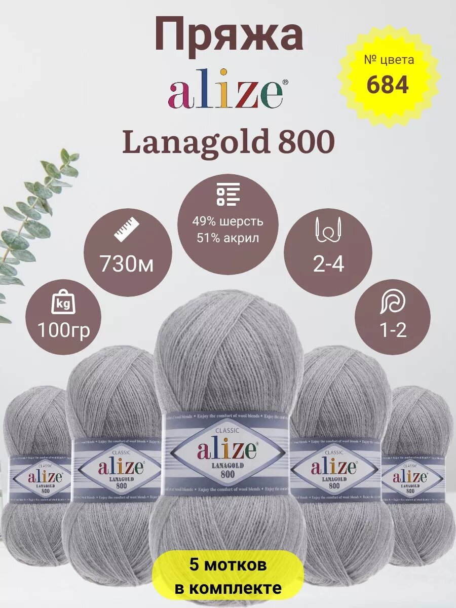 Пряжа ALIZE LANAGOLD 800, средне-серый - 182, 49% шерсть, 51% акрил, 5 мотков, 100 г, 730 м.