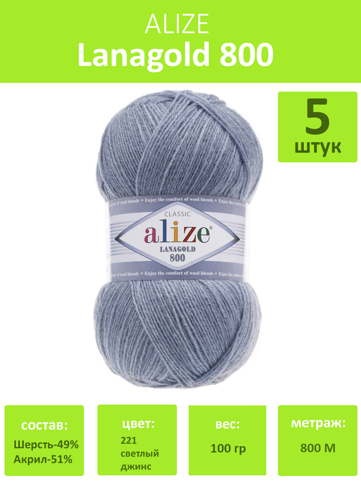 Купить Пряжа ALIZE LANAGOLD 800, светлый джинс - 221, 49% шерсть, 51% акрил, 5 мотков, 100 г., 730 м.