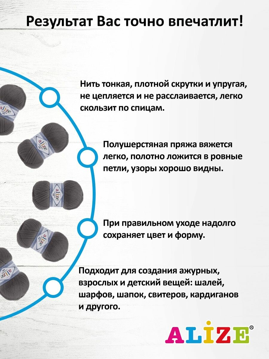 Пряжа ALIZE LANAGOLD 800, средне-серый - 182, 49% шерсть, 51% акрил, 5 мотков, 100 г, 730 м.