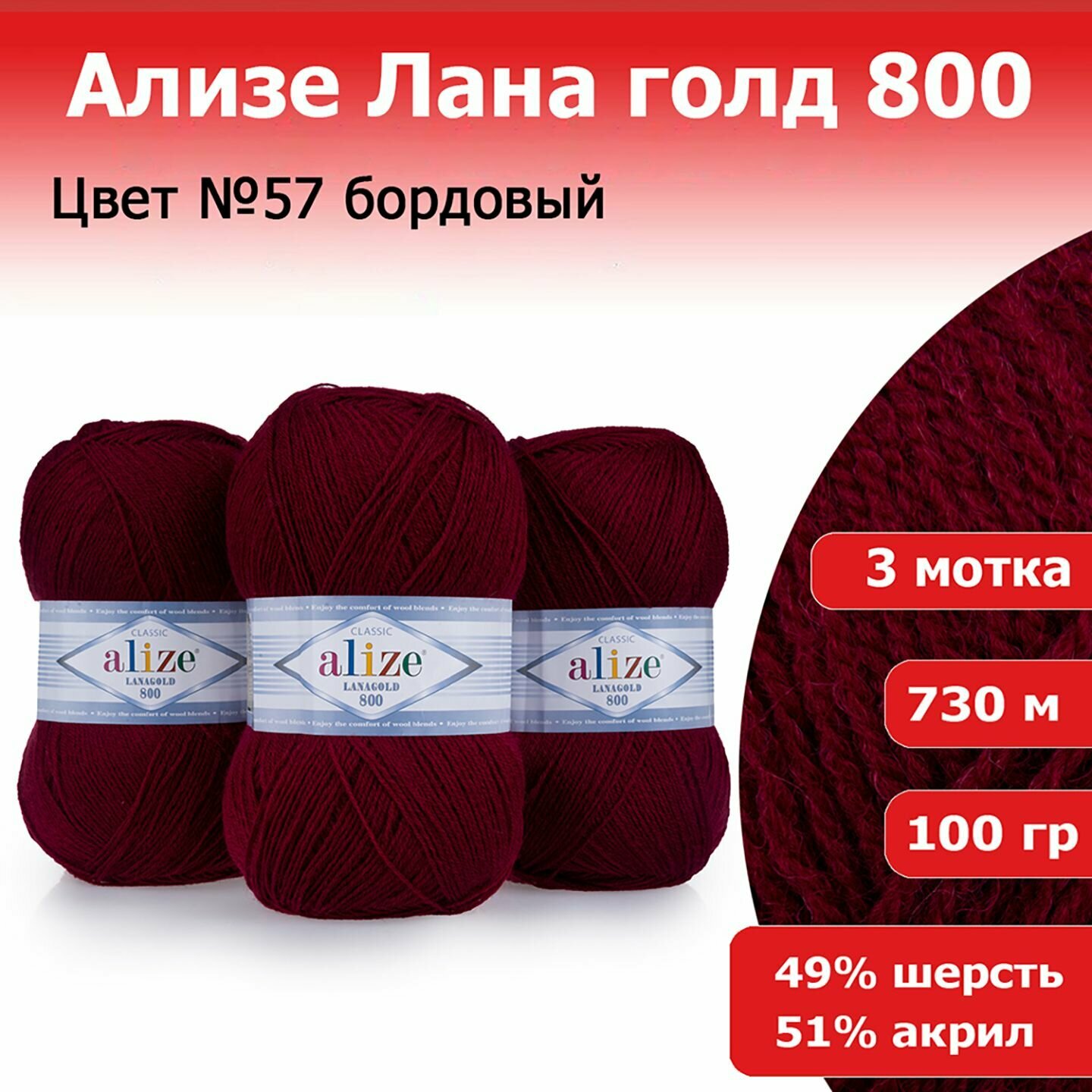 Купить Пряжа Alize Lanagold 800 бордовый (57), 51%акрил/49%шерсть, 800м, 100г, 3шт