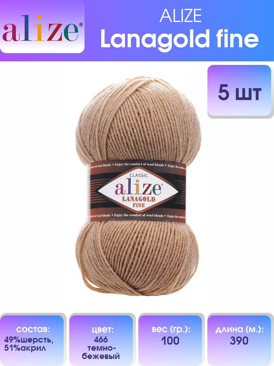 Пряжа ALIZE LANAGOLD FINE, т. бежевый - 466, 49% шерсть, 51% акрил, 5 мотков, 100 г, 390 м.