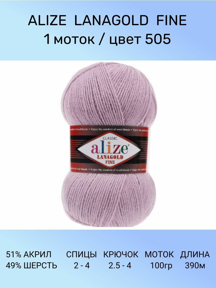 Пряжа для вязания ALIZE LANAGOLD FINE: 505 (пепельно-сиреневый), 1 шт 390 м 100 г, 49% шерсть 51% акрил