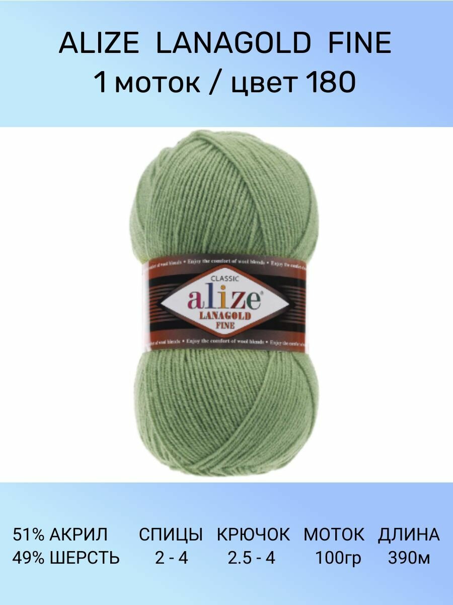 Пряжа для вязания ALIZE LANAGOLD FINE: 180 (серебряная сосна), 1 шт 390 м 100 г, 49% шерсть 51% акрил