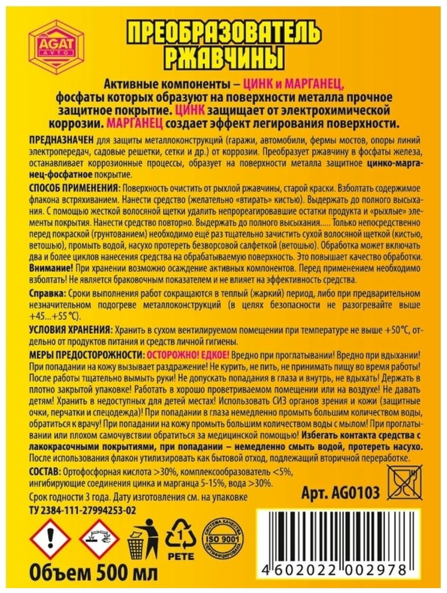СохранитьПреобразователь ржавчины цинкарь AGAT AVTO (флакон) 500 мл AGAT AVTO AG0103 интересное: