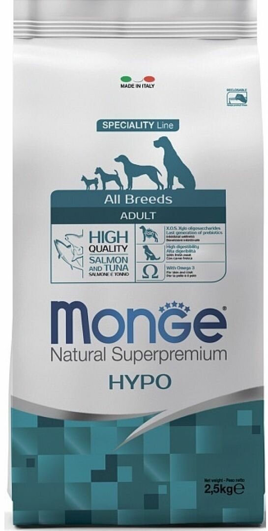 Корм сухой Monge Dog Speciality Hypo для взрослых собак всех пород, с лососем и тунцом, 2.5 кг