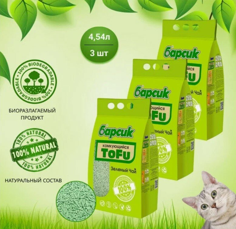 Комкующийся наполнитель Барсик Tofu Зелёный Чай, 4.5л, 3 шт.