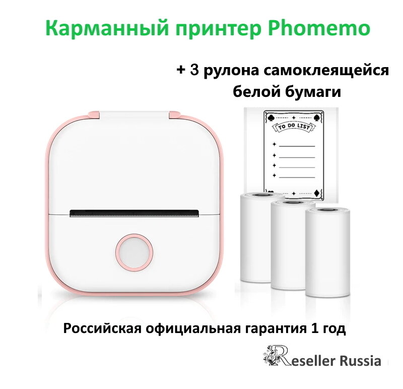 Мини принтер Phomemo T02 White + 3 рулона самоклеящейся бумаги, карманный принтер для смартфона, белый