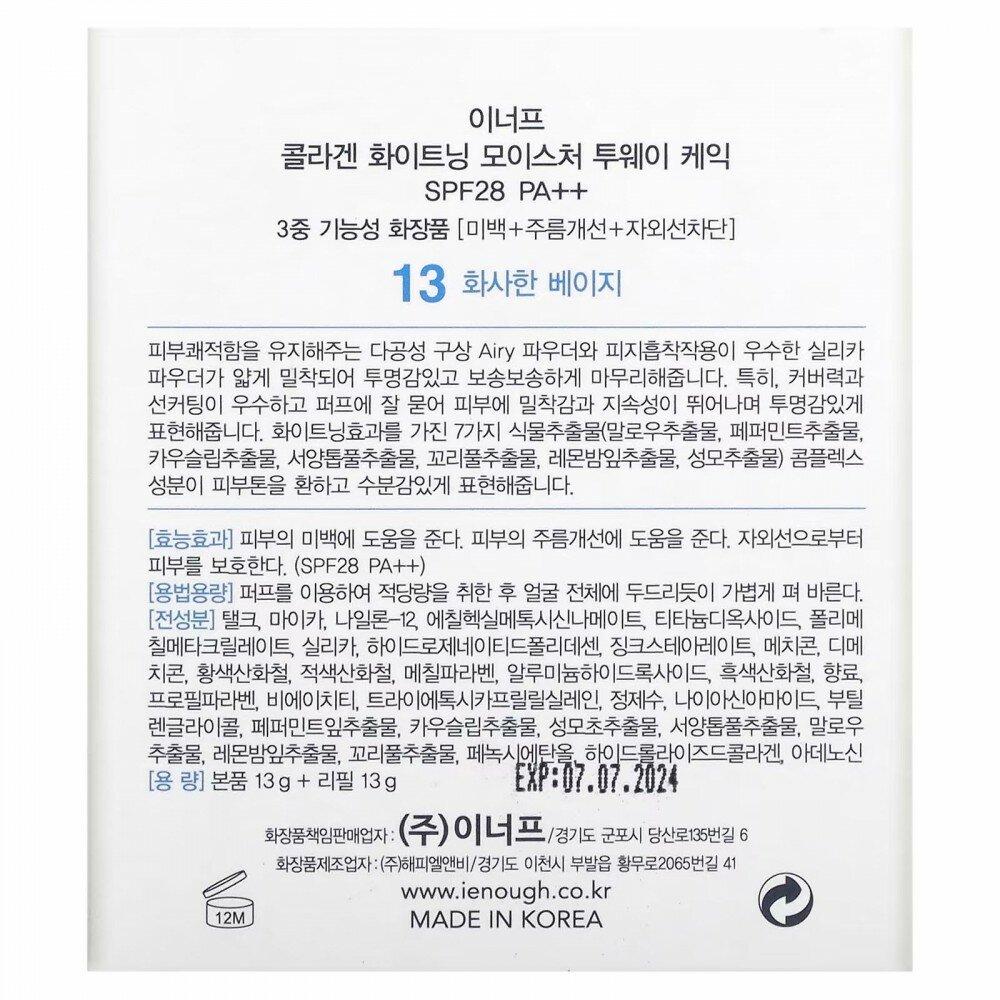 Enough Пудра для светлой кожи со сменным блоком / Collagen Whitening Moisture Two Way Cake SPF30 PA+++, 13 мл*2