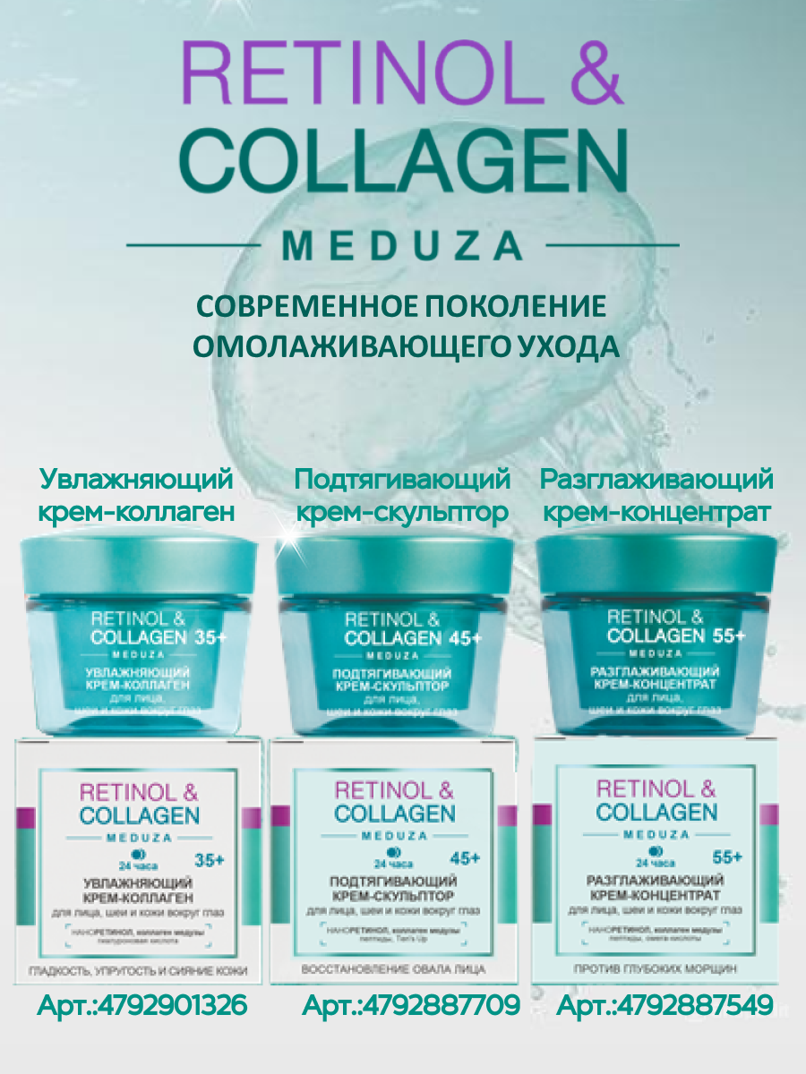 Retinol&collagen meduza крем-коллаген для лица шеи кожи вокруг глаз 35+ антивозрастной 24ч с гиалуроновой кислотой 45мл, ночной дневной, косметика