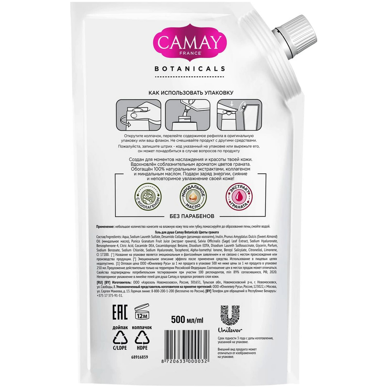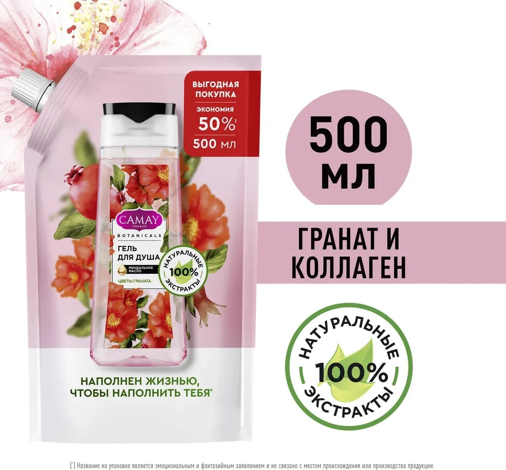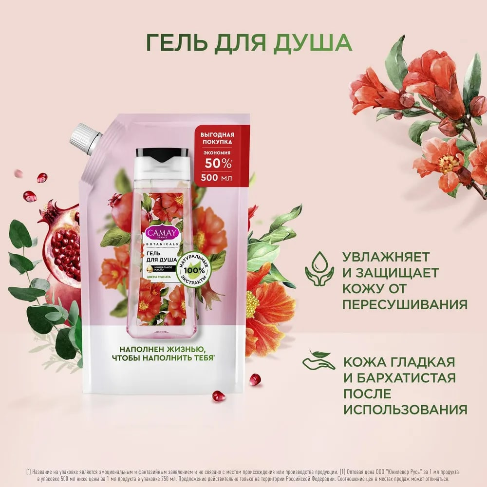 CAMAY BOTANICALS цветы граната гель для душа с коллагеном миндальным маслом на 100% натуральной основе 500 мл