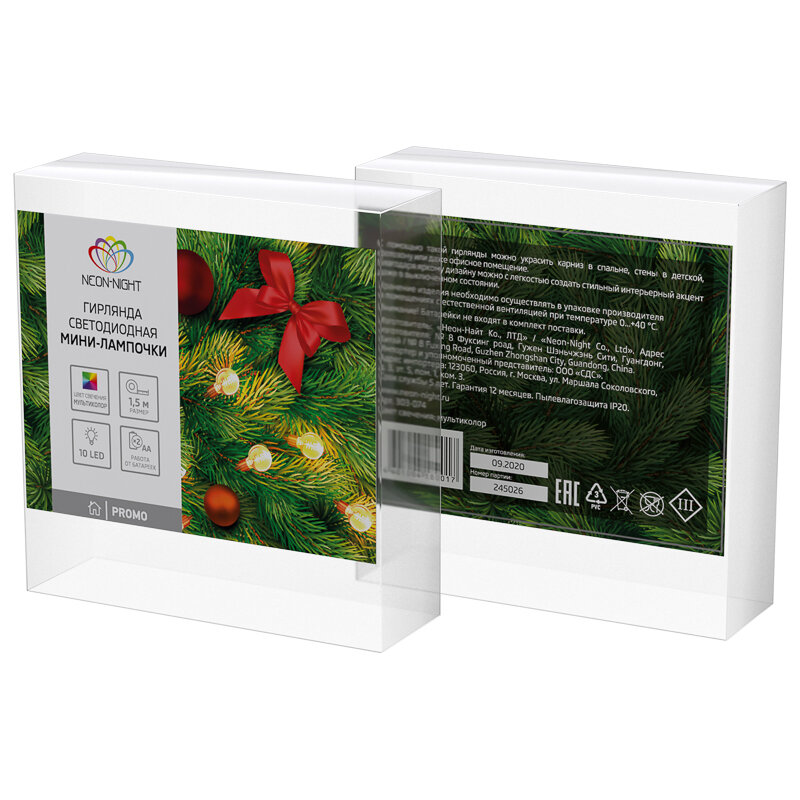 Гирлянда светодиодная «Мини-лампочки» 1.5 м, 10 LED, прозрачный ПВХ, цвет свечения мультиколор, 2 х АА (батарейки не в комплекте) NEON-NIGHT Артикул 303-074