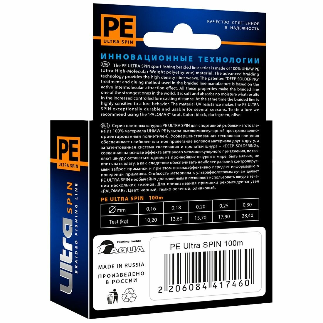 Плетеный шнур для рыбалки AQUA PE ULTRA SPIN Black 0,18mm 100m, цвет - черный, test - 13,60kg