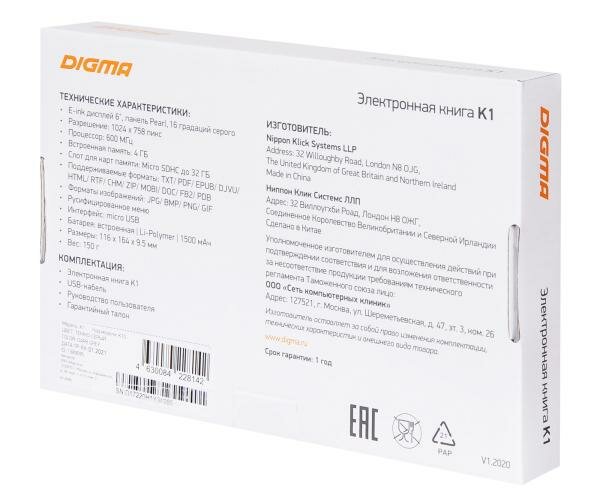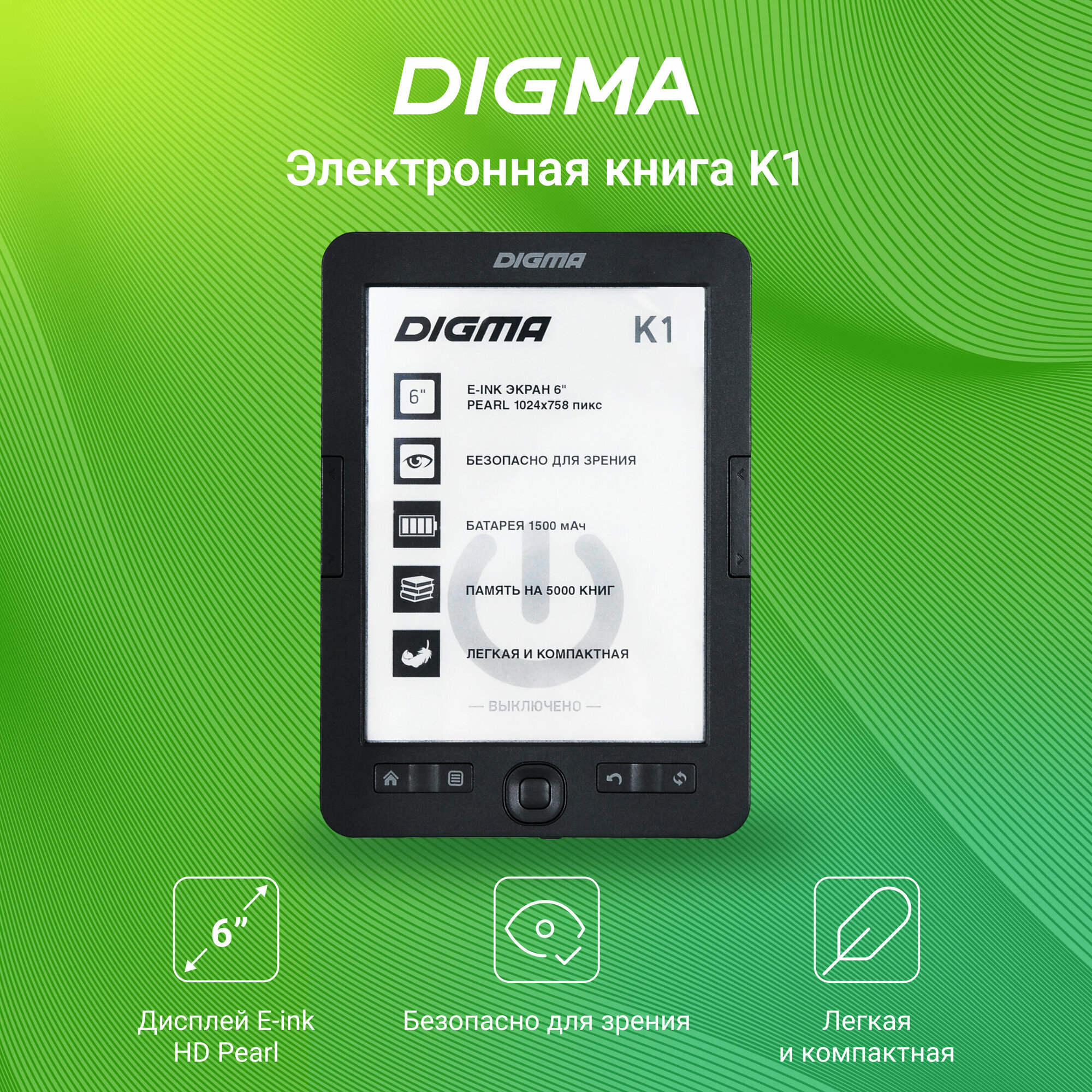 Электронная книга 6" Digma K1 E-Ink, 4Gb, темно-серый (K1G)