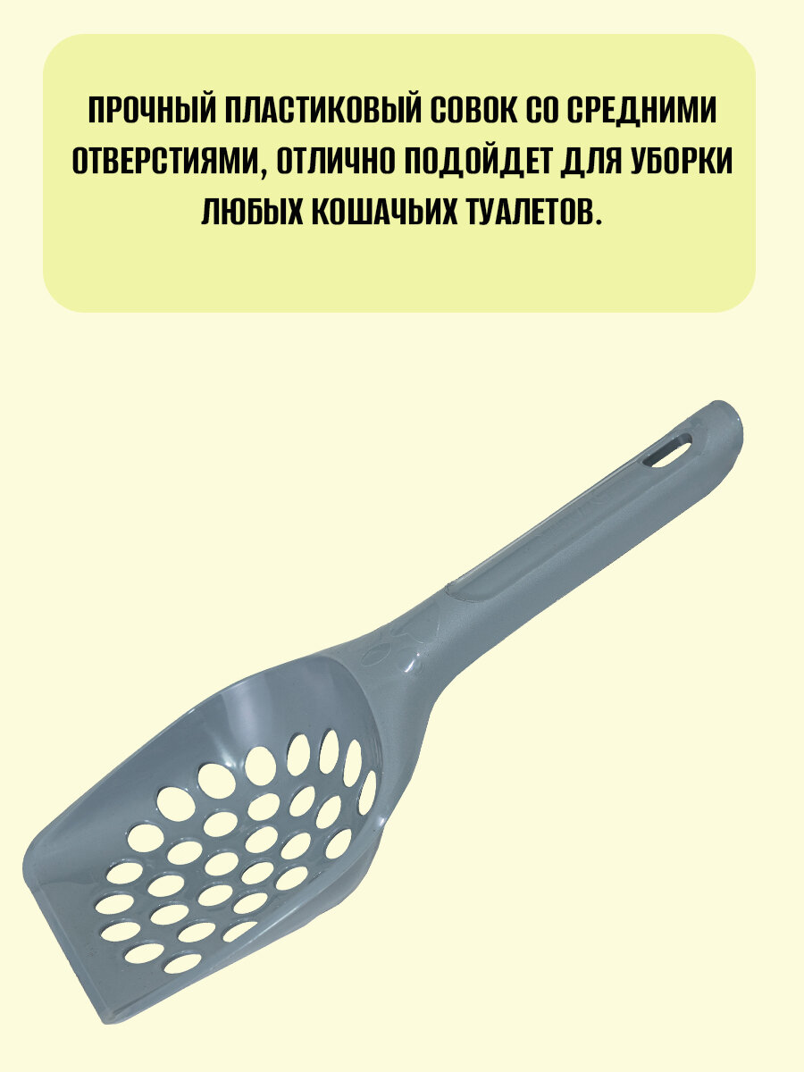 | Плюсы: | Лучший совок для комкующихся наполнителей. Мы используем наполнитель на основе бентонитовой глины. Идеально. Сухой наполнитель легко и быстро просыпается через отверстия, а комки и экскременты остаются в совке. Также у него достаточная жесткость, чтобы зачерпнуть, прилипшую к полу лотка мокрую глину. |