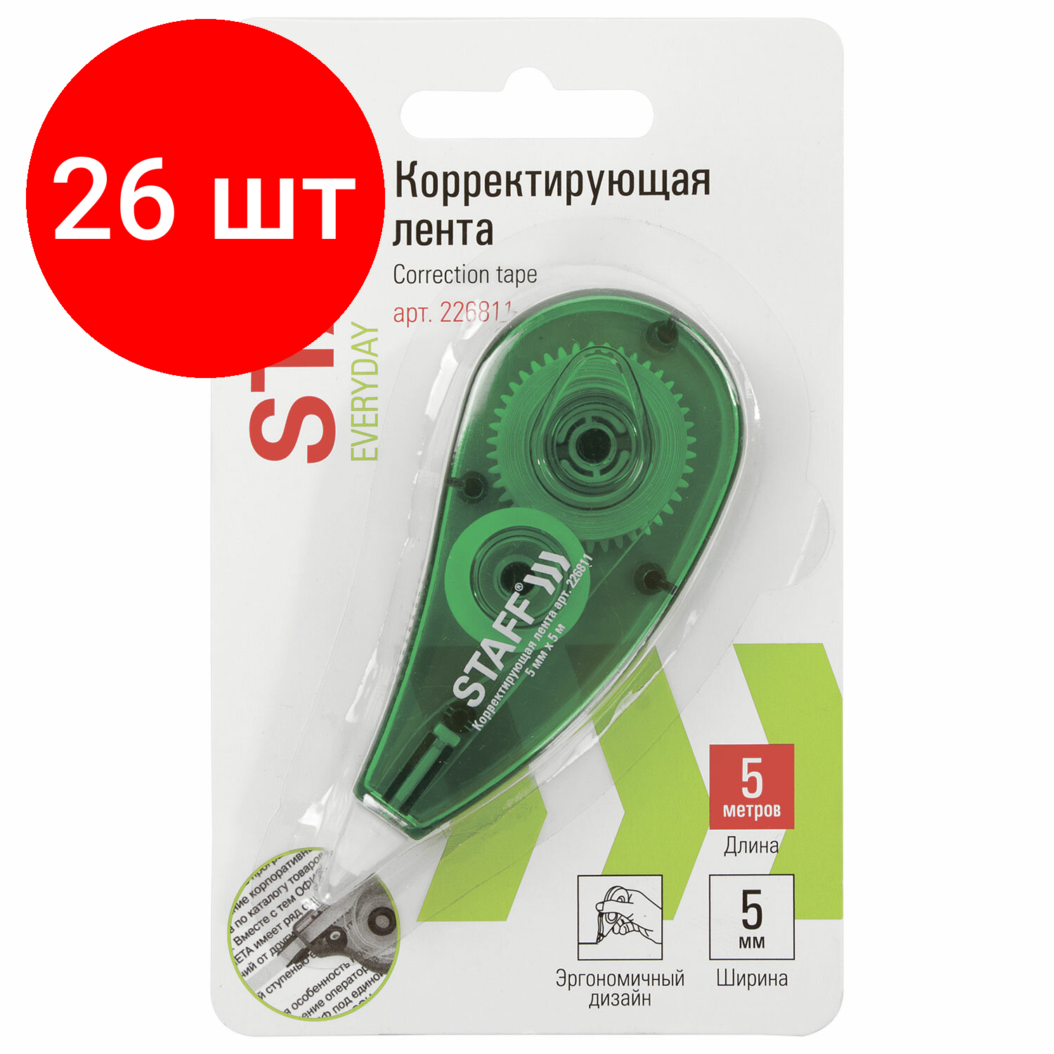 СохранитьКорректирующая лента STAFF "EVERYDAY", 5 мм х 5 м, корпус зеленый, блистер, 226811 Комплект - 12 шт . интересное: