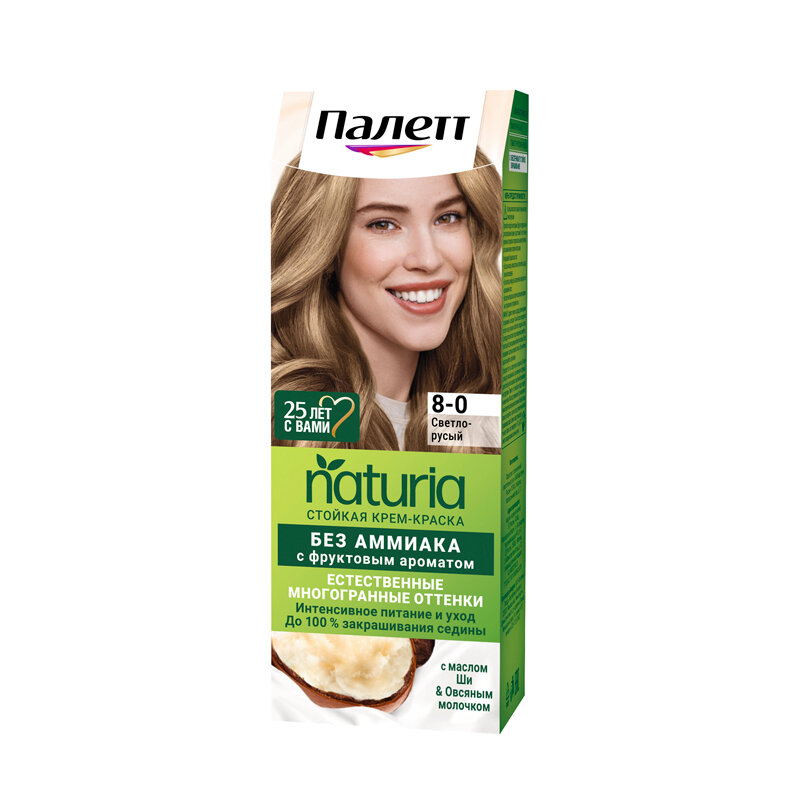 Палетт Naturia Стойкая крем-краска для волос, 8-0 Светло-русый, 110 мл - 6 шт