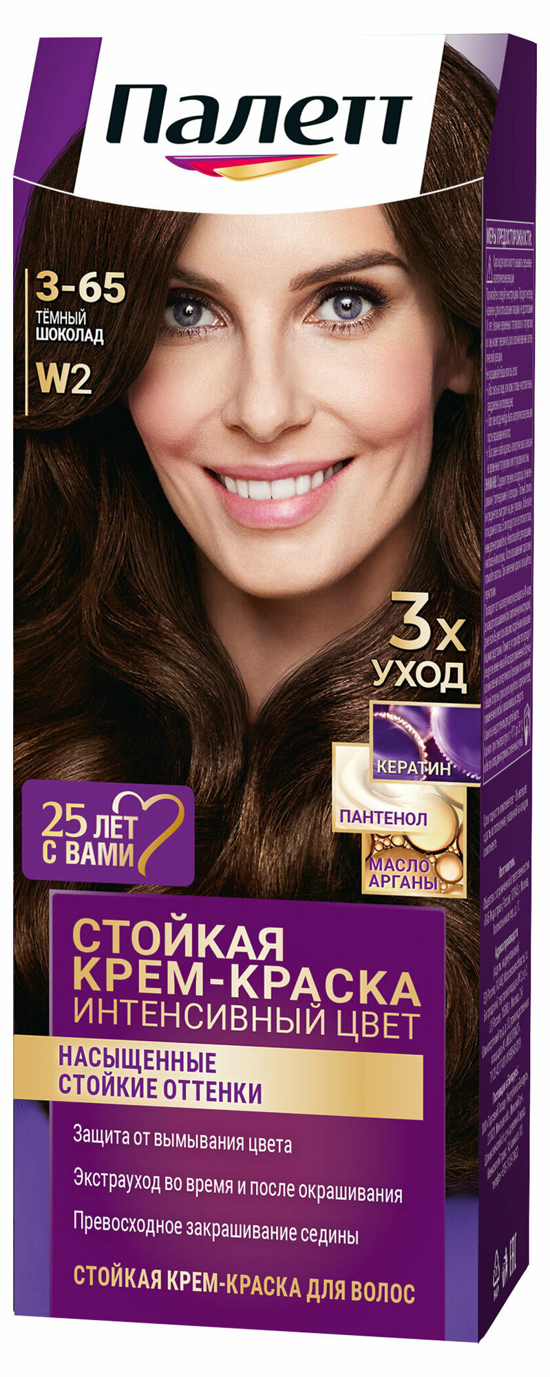 Палетт Стойкая крем-краска Интенсивный цвет, W2 3-65 Темный шоколад, 110 мл - 3 шт