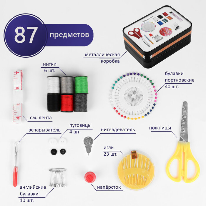 Купить Набор для шитья, 87 предметов, в металлической коробке, 14.5 x 10 см