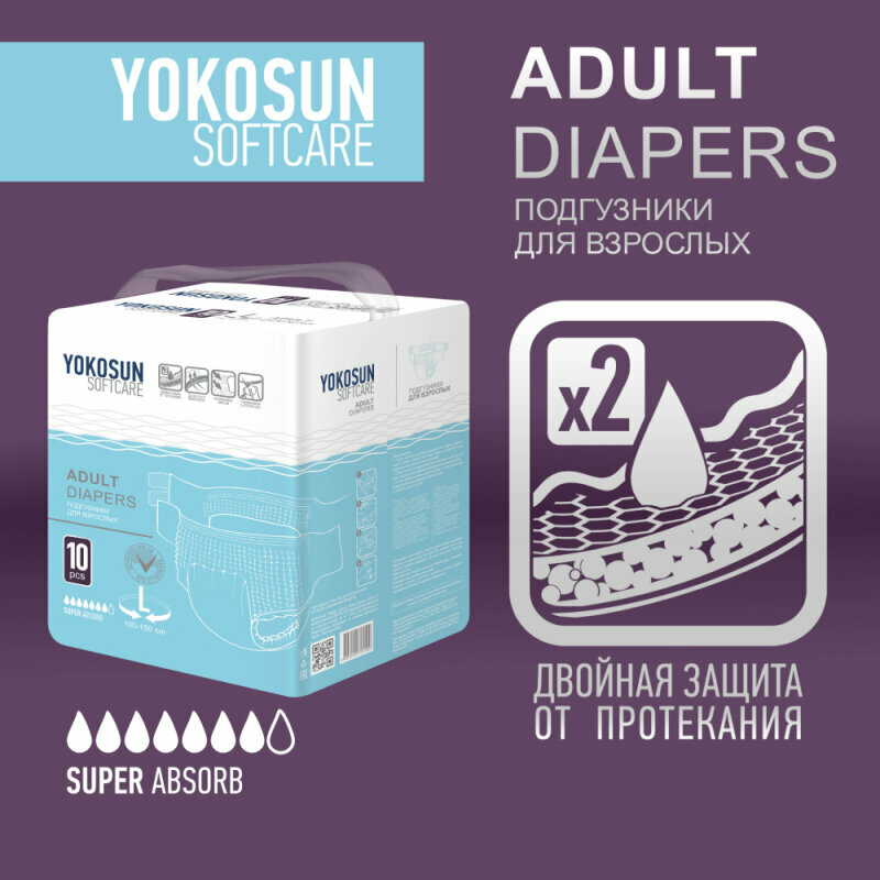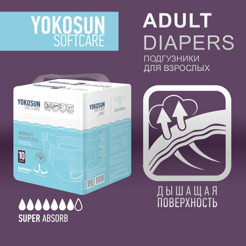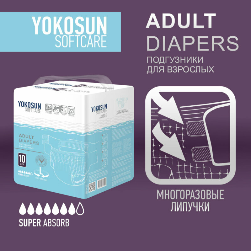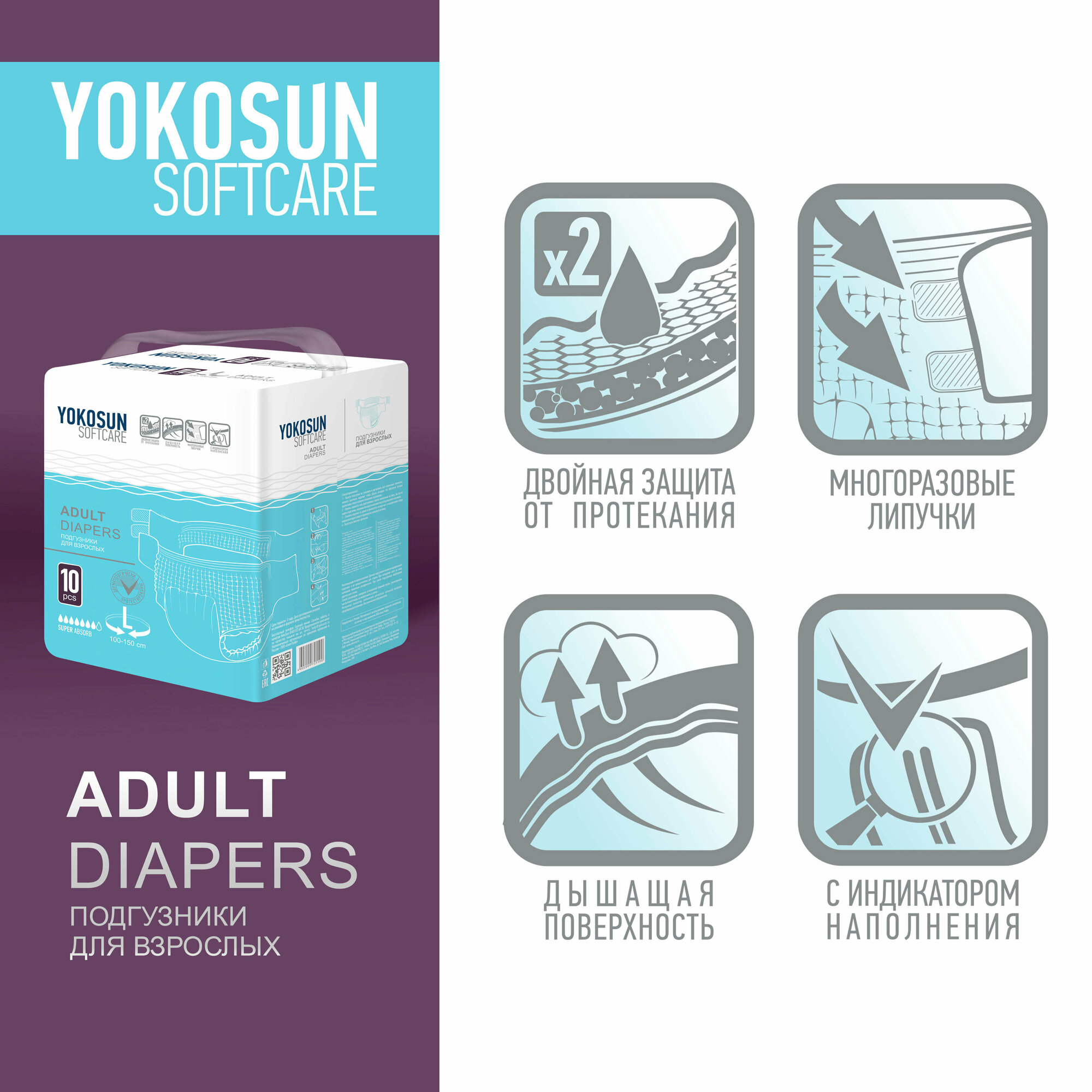Подгузники для взрослых YokoSun Softcare на липучках, размер XL, 10 шт.