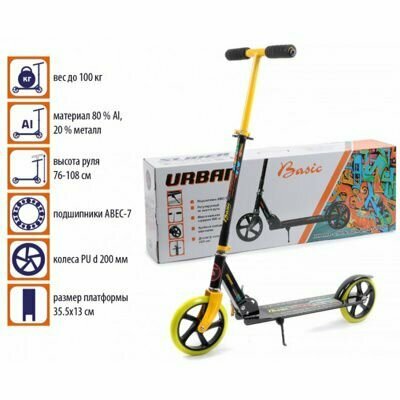 Самокат складной BASIC URBAN колёса 200 мм до 100 кг тормоз-крыло игротрейд SU1Y Чёрный/Жёлтый