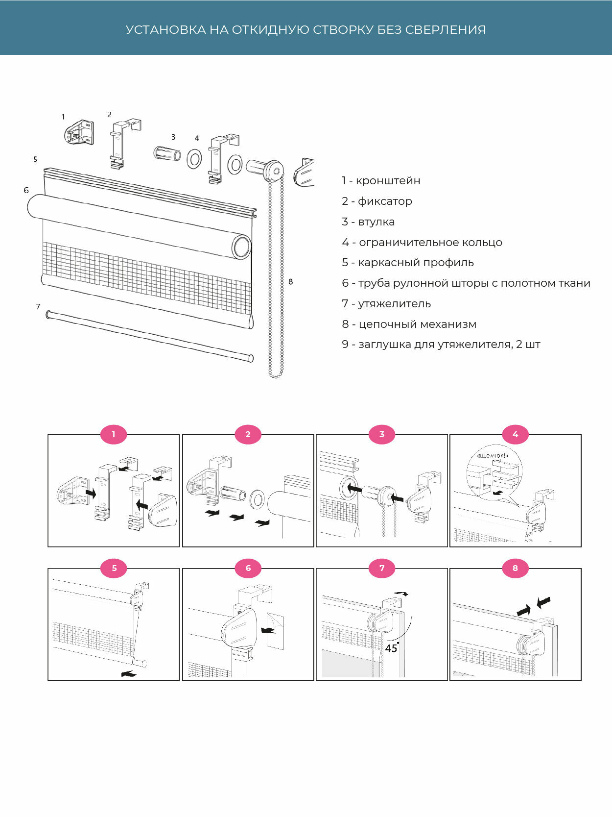 | Комплектация | рулонная штора мини в сборе, цепочный механизм, комплект кронштейнов для откидной створки без сверления, утяжелитель для ткани с фиксирующими заглушками, инструкция по монтажу |