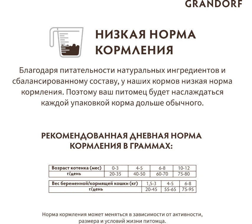 | Дозировка | на средний возраст котенка 5-6 месяцев: 50-60 г в день |